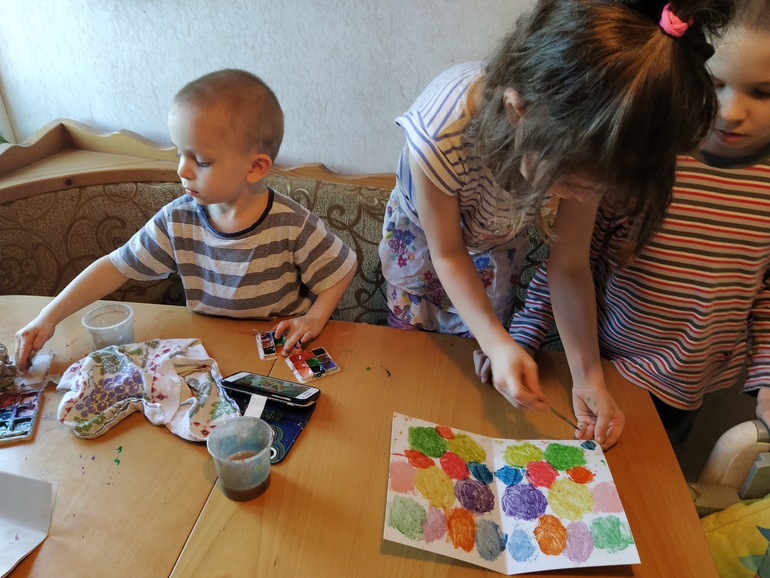Младшие вечером смотрели Кузю, немного порисовали красками. Как не странно сегодня рисовали аккуратно.
