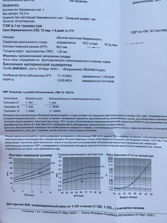 По первому скринингу... Из-за того, что какой-то там риск близок к минимальному значению (минимум - 1:300, у нас - 1:400), на второй нужно будет ехать в соседний город. Нужна консультация генетика. Но врач сказала, что риск на самом деле низкий, переживать не стоит.