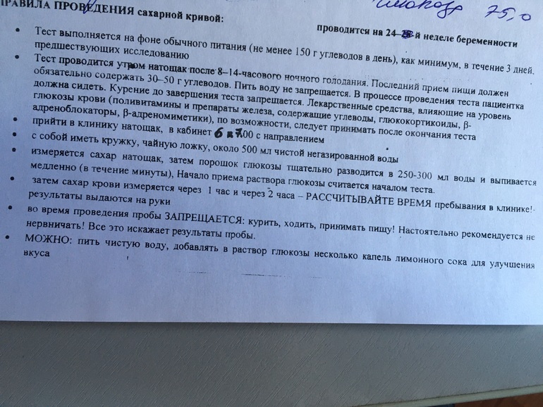 Дали мне направление еще на ГТТ (глюкозотолерантный тест). Дали и инструкцию, как его сдавать.