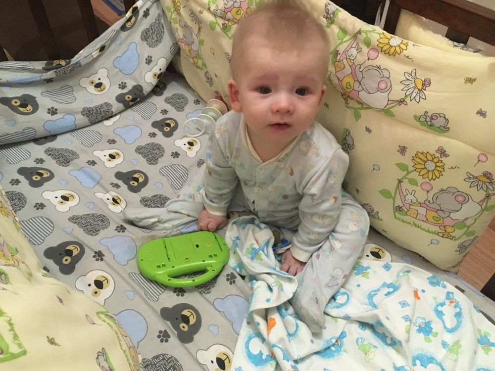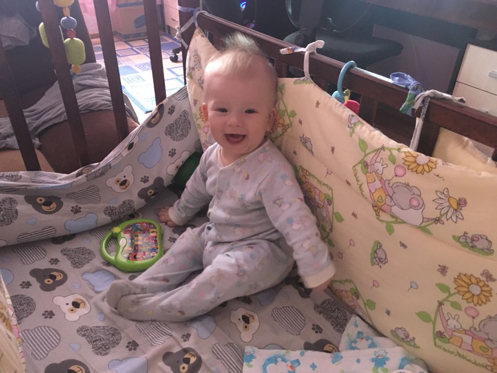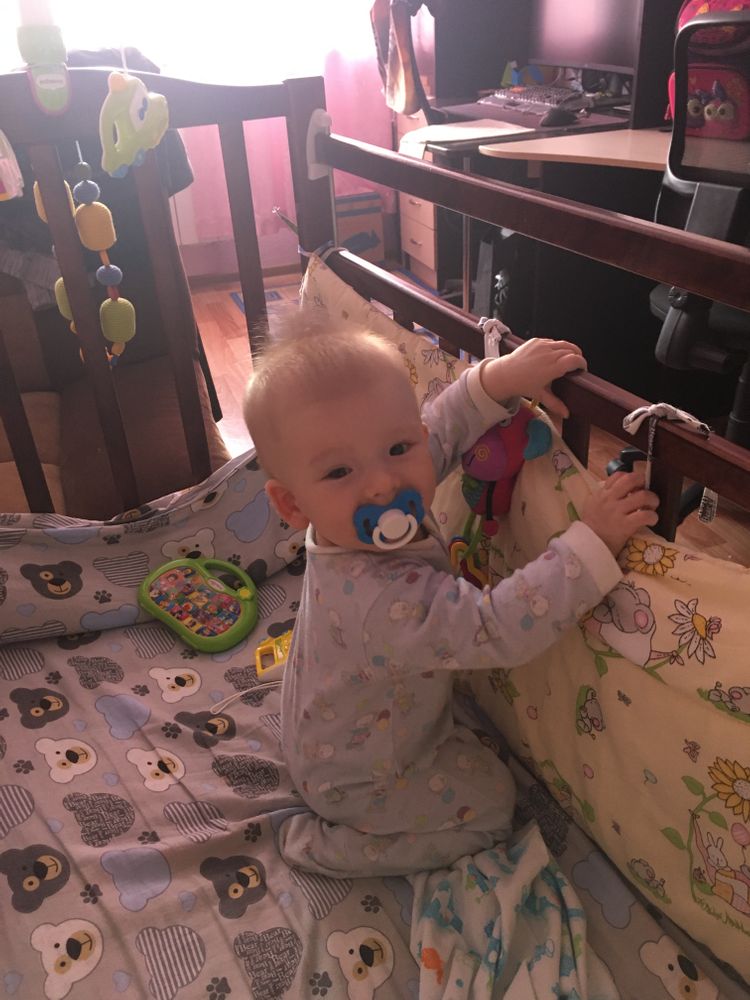 Получается, Миша сел в 6 месяцев и 12 дней. Для сравнения, Алиса села сама почти в полные 8 месяцев, а там уже через неделю встала в кроватке. Миша уже и это пытается сделать, одну ножку выставляет и старается на нее опереться.