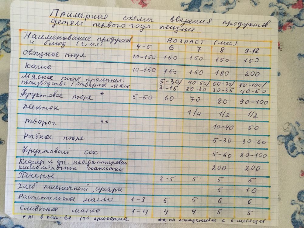 В целом ничего нового! Но хочу сюда выложить табличку по правильному введению прикорма, которую дала мне сфотографировать медсестра. По ее словам, это последние данные, которые они привезла с обучения: