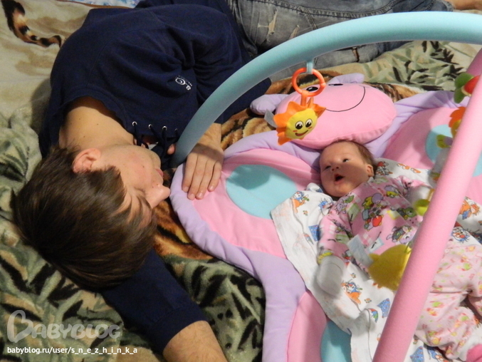 Из всего коврика детка впечатлилась только солнышком :) и то на пару минут :) в остальное время она строила глазки папе )))) В общем, отложили коврик до лучших времен :))