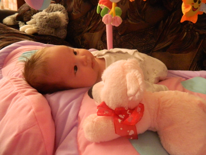С любимым мишкой :) Постоянно хватает его за нос :)))