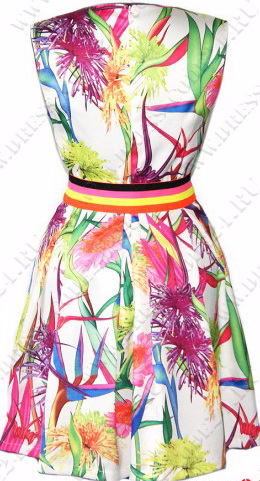 Белое платье с ярким принтом, отрезное по линии талии, юбка клеш со складками. Круглый вырез горловины, на спине потайная молния-застежка, боковые втачные карманы. Пояс в комплекте.