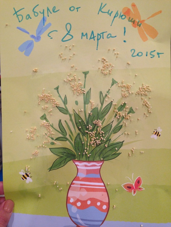 Прочитала задание (приготовить открытку-мимозу на 8 марта для бабушки - и множество идей и вариантов) и почему-то четко поняла: будем делать мимозу из пшена. Мелкая моторика и мелкая такая уборка потом, всего-то на полкухни! Но сначала мне показалось правильным провести предварительную подготовку, ведь как можно делать мимозу, ни разу ее не видя? Тут можно весьма чудесатый результат получить.