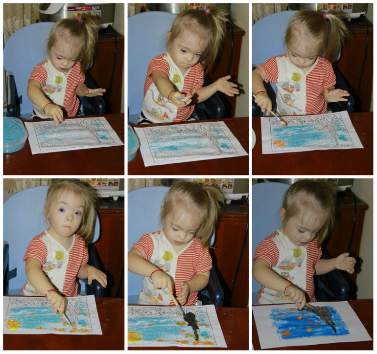 и наше творчество. посыпать синей манкой понравилось. но все это перешло в закапывание листочка. пришлось стряхнуть и дать кисточку. тут Маше понравилось рисовать звездочки. причем она просила читать стихотворение про звездную ночь. прогресс очевиден. она четко попадает в кружки звездочек и раскрасила скалу. может не много я помогла. а вот на втором рисунке я разукрасила фон. а Маша с удовольствие рисовала точки-звездочки. как то с творчеством сейчас не очень.