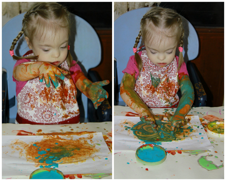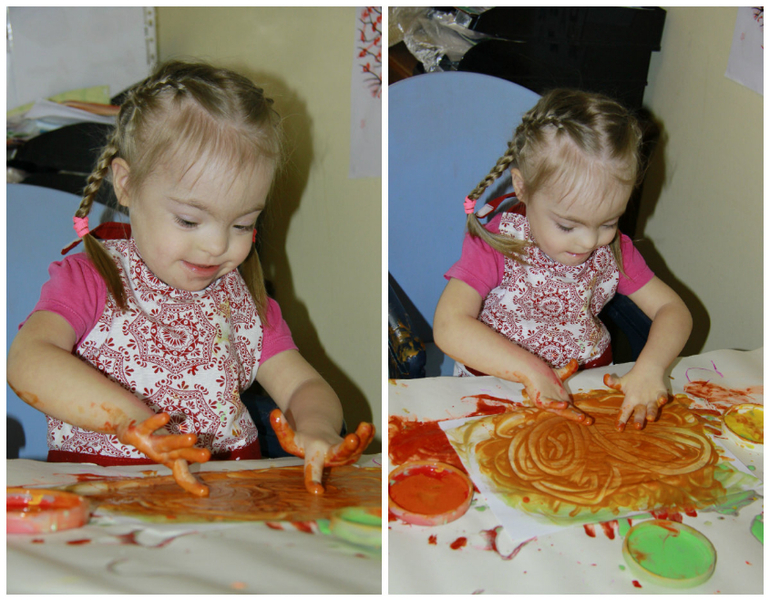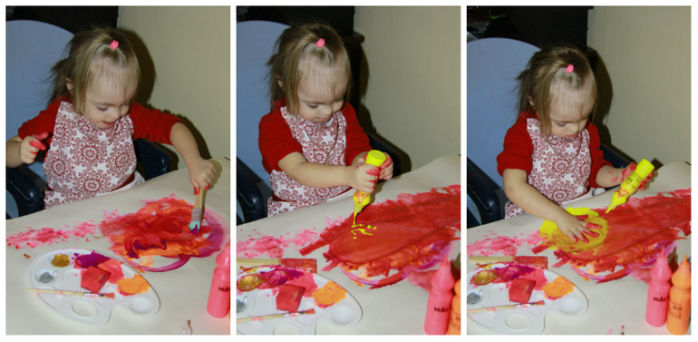 И свободными вечерами, если у нас были силы, мы рисовали, точнее купались в красках. Ну если уж нравится мазаться, то мажься. Хотя и к этому процессу мы пришли не сразу. Сначала полюбилось рисование ладошками, потом стали лить краски в прямом смысле ( краски лились сверху из тюбиков, а Маша типа мыла руки. ей так это нравится. она просила еще и еще. при чем указывала какой цвет следующий. у папы сердце плакало. сколько красок перевели