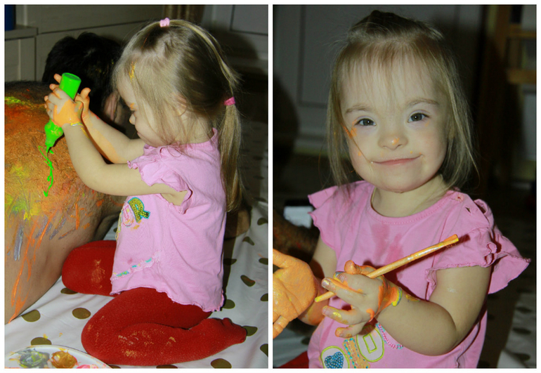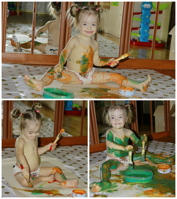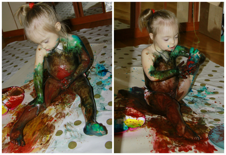 Как то я увидела у анастасии краски для бодиарта тык и мне захотелось повторить. Долго готовила папу, а потом и я решилась. Но Маша не так радостно встретила эту идею. Я заметила что она не так охотно мажет свое тело и вздрагивает от краски. Прохладная краска и не знакомые, давно забытые ощущения. Но она с удовольствием поиграла в ролевые игры с кисточками. Смотрела как они ходят и оставляют следы. Вела диалоги. Уж и не знаю что там было