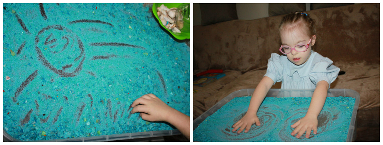 вспомнила что у меня есть синий песочек, ракушки. так родилась эта идея. сенсорная коробка под классическую музыку. музыкальные номера брала здесь