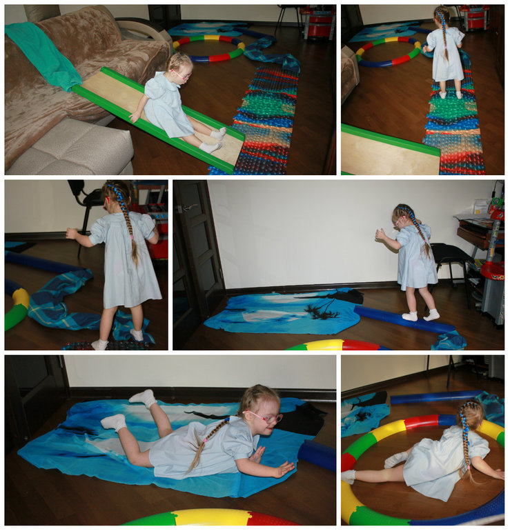 макет рек из дорожки препятствий: с гор ( диван) бьет водопад. по водопаду маша попала в горную реку, по ней пришла к извилистой реке на равнине. потом река впала в море. конечно Маша сразу нырнула в море. а от туда в бассейн