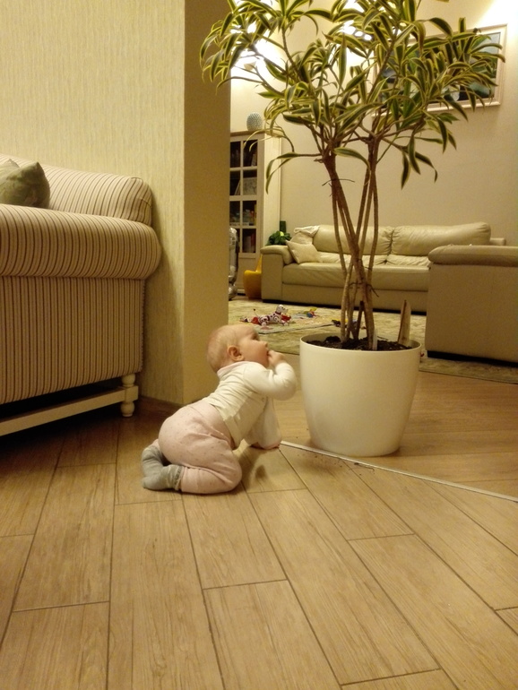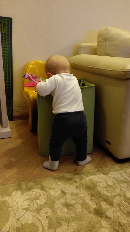 Уверенно стоит, ходит по опоре. Поднимается по любой поверхности. Из положения стоя при удачном стечении обстоятельств садится. При неудачном падает. Лоб постоянно с шишкой (все попытки опуститься на четвереньки у стенки заканчиваются соударением с оной). Ползать начала в 6. Вставать уверенно в почти 7.