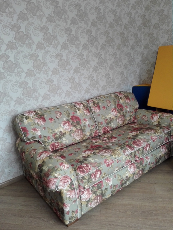 Есть комната, которая сейчас не используется. В ней есть диван, купленный срочно срочно положить гостей на новый год. Он зеленый на самом деле. Фото плохо передает цвет основного фона.