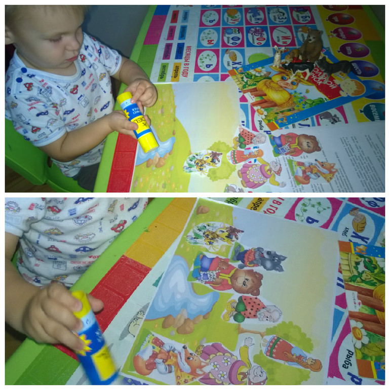 Затем "пасли" бычка - я заменила предложенных в рассылке персонажей. Марку очень понравилось клеить - мы в первый раз работали со стиковым клеем.