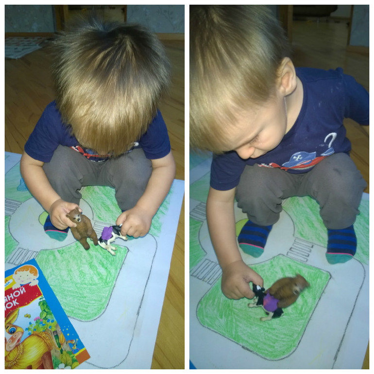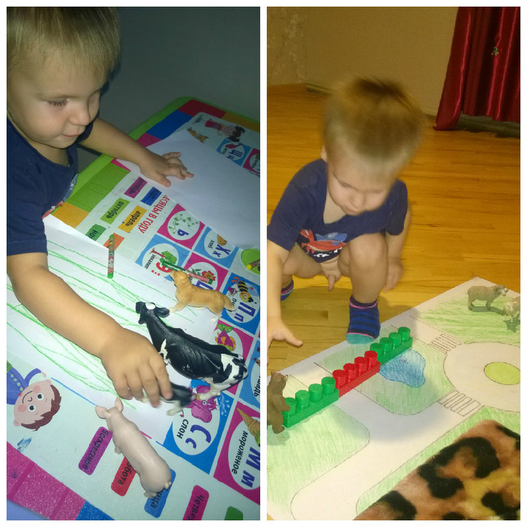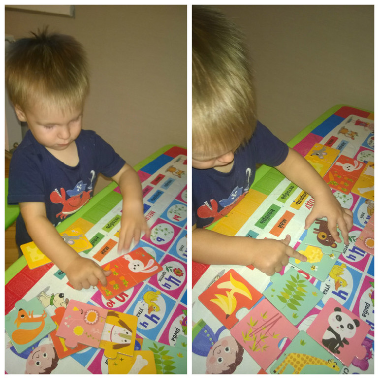 Поиграли в ассоциативное лото. Тоже с лёгкостью справился, любит такие штуки, параллельно ставили на лото фигурки животных.