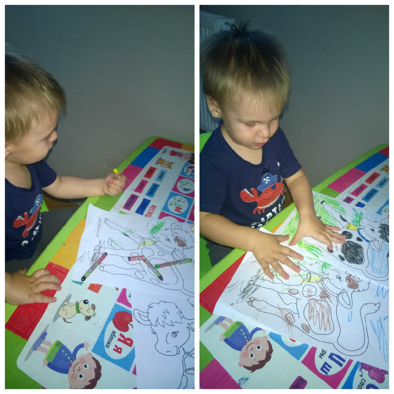 Вместе раскрашивали бычка. Марк повторял за мной и выбирал те цвета, которым я раскрашивала своего. Затем Марк выбирал, чей рисунок лучше)))) В итоге, оба повесили на стенку