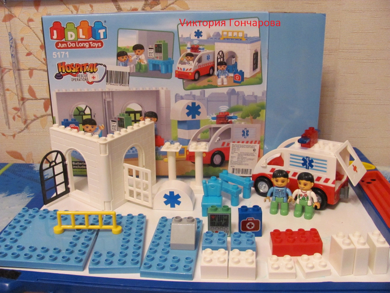 27. Набор фирмы JDLT, аналог лего дупло - жаль не стыкуется с ним. Купила из-за скорой помощи, очень часто играл с ним.