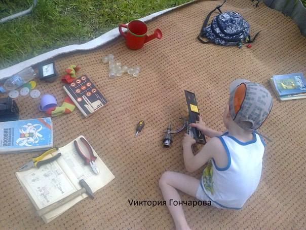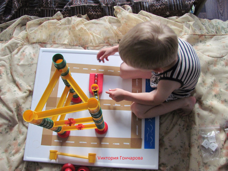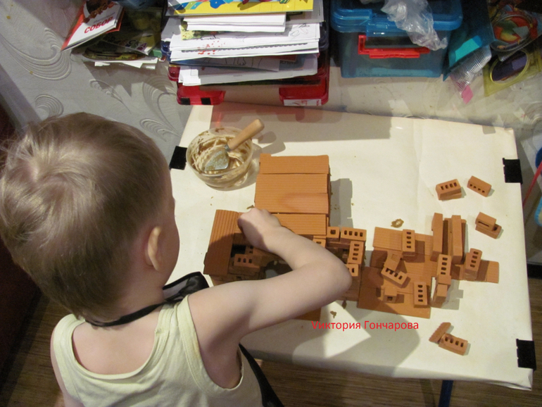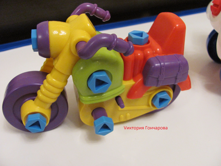 Вначале появился мотоцикл. Конечно собирала мама, но под пристальным вниманием ребенка. Позже начал подавать нужные детали, и потом уже сам собирал.