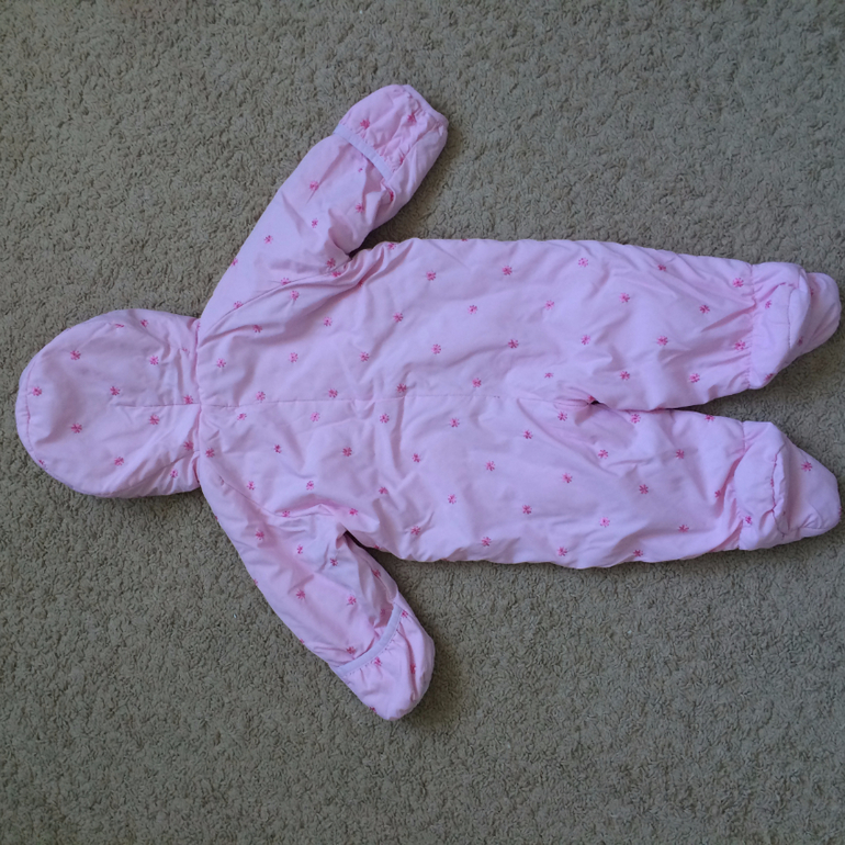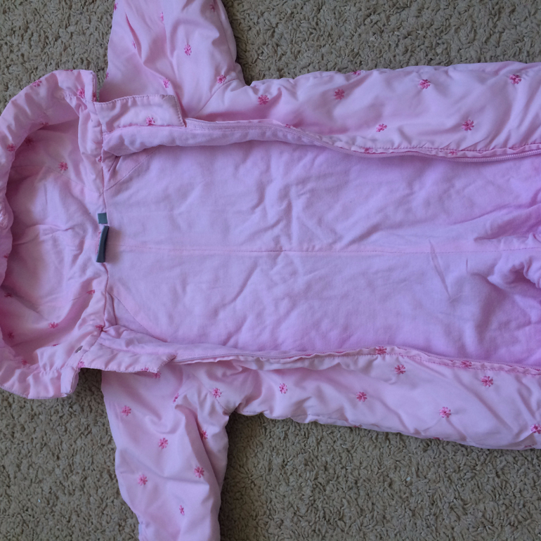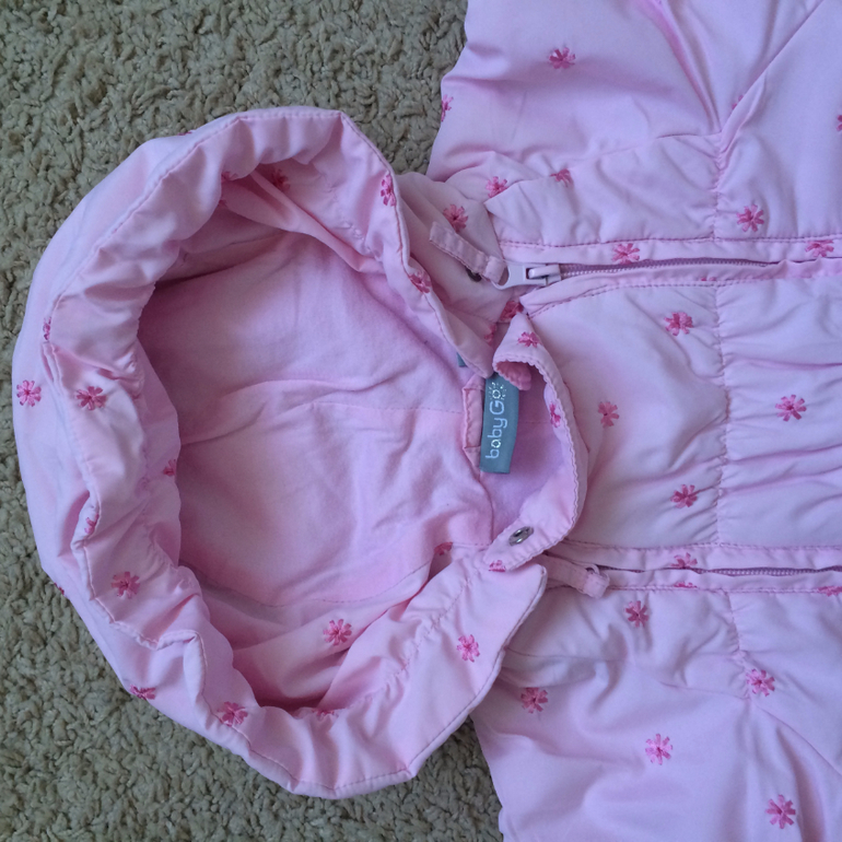 Нежно розовый комбезик на легкой хлопчатобумажной подкладке, на весну, на девочку 74 см. На самом деле комбезик большемерит, и мне при покупке основных видов одежды на рост 74, этот помбезик приходилось закатывать рукавички...