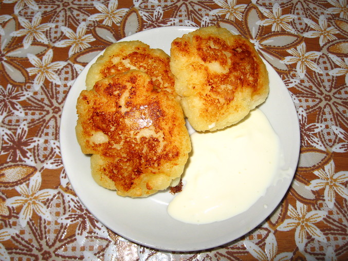 Творог 0,5 кг, 0,5 стакана муки, 1 яйцо, сахар по вкусу. Можно подавать со сметаной, сгущенкой, вареньем.
