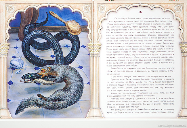 «Он опустился на лапки почти поперёк спины Нагайны и, будь Рикки-Тикки старым мангустом, он понял бы, что ему следует, куснув её один раз, сломать ей спину; но он боялся страшного поворота головы кобры. Конечно, Рикки кусал змею, но недостаточно сильно, недостаточно долго и отскочил от её хлеставшего хвоста, бросив раненую и рассерженную Нагайну.»