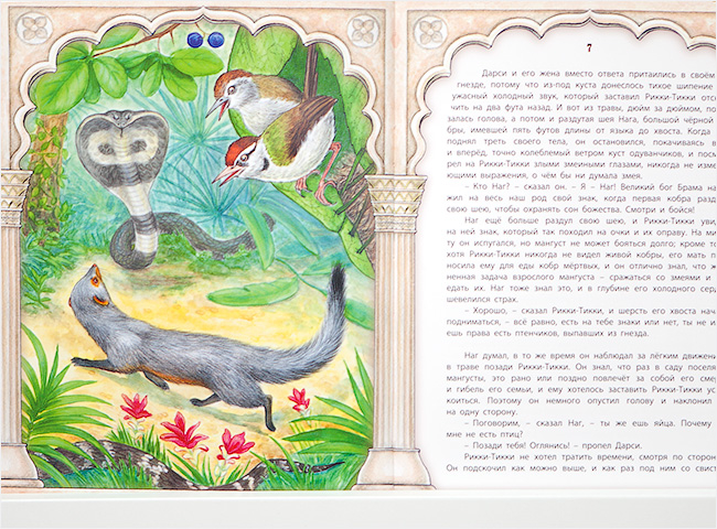 Во-первых, иллюстрации в книге хоть крупные и довольно красочные, конечно, совсем не тянут на шедевры книжного искусства. Тем не менее, мне очень хотелось познакомить Алису с произведением про отважного мангуста, а ничего лучше этого на книжном рынке сейчас не представлено, так что я решилась на эту книгу.