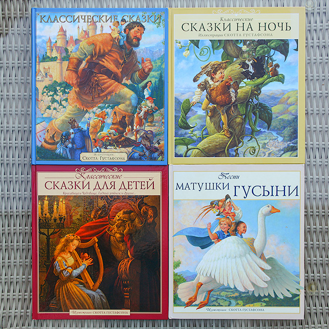 Первая книга - самая детская, с короткими английскими стишками - «Песни матушки гусыни», а три последующие - это известные во всем мире сказки, пересказанные автором иллюстраций на свой лад.