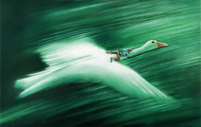 Но как только дело доходит до изображения людей, ну и, собственно, самого Нильса, то сразу обращаешь внимание на непривлекательные для глаза пропорции и нарушенную перспективу. Мне откровенно обидно, что волшебные миры Хешельман разбавляет вот такими вот образами людей.