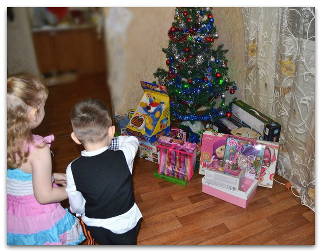 а это собственно налет на игрушки)))пока сестра с пашкой увели детей в комнату искать подарки,мы с ваней носились как угорелые,подарков много-а рук мало)))дети наверное думали что там не дед мороз под елку подарки кладет,а как минимум стадо слонов бегает