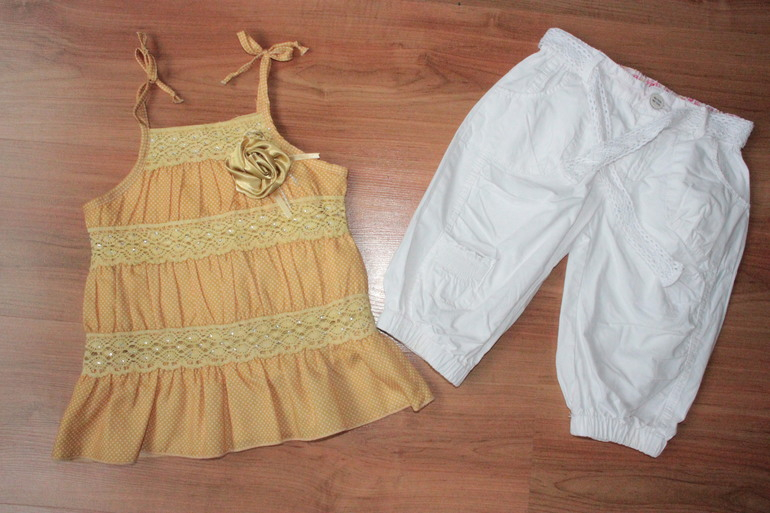 Комплект белые брючки-капри и туничка с брошью и стразами. Размер 110, Экв. 800