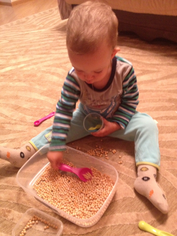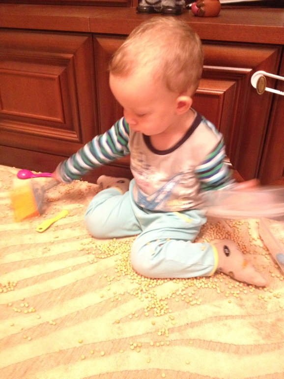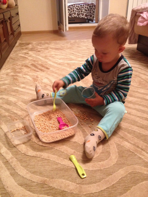КостяИгра началась с пересыпания гороха, а закончилась пробой гороха, хождением по нему и вырабатыванием навыка уборки. (фото под кат)