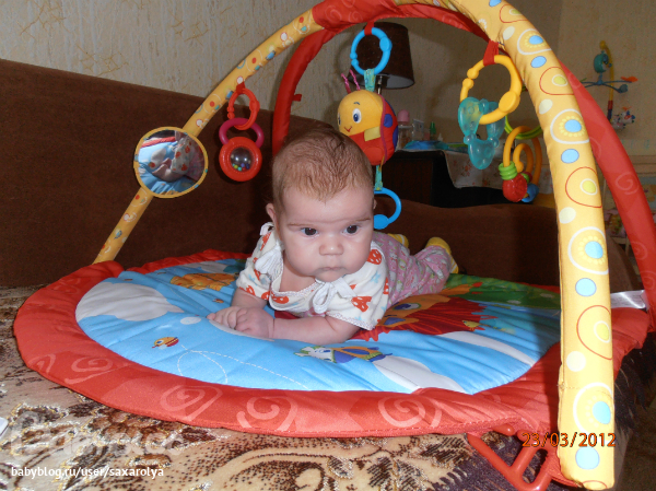 Весим мы 5кг 800гр (родились 3кг 900гр). Улыбаемся и смеемся во всю, но капризничать тоже любим (особенно в больнице, аж стены трясутся), агукаем, слушаем музыку, очень любим смотреться в зеркало и когда на руках носят)) обожаем мужчин, особенно деда)) папочка наш служит и увидим мы его только в 5 месяцев