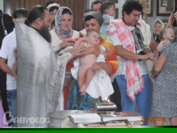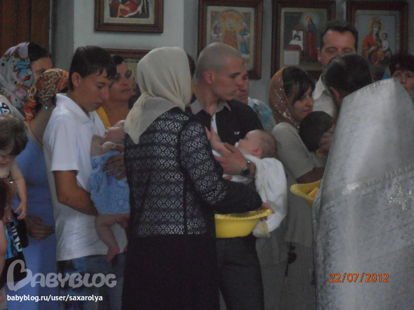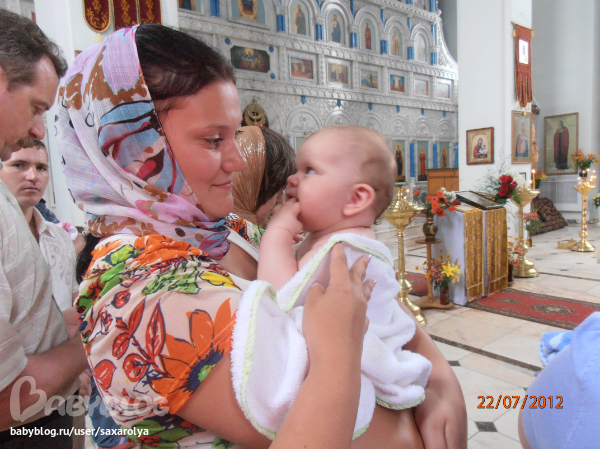 Все совершенно не организованно, не так я себе это таинство представляла. Куча всяких бабулек, чьи то родственники с маленькими детьми, которые носятся по всей церкви и которых я поймала чуть ли не на выходе из церкви с нашей коляской и вытащенными оттуда игрушками. Альбиночка у нас умничка, выдержала стойко все 4 часа, немного поплакала только когда спать захотела. В итоге минут 20 поспала, а потом ее батюшка какой то вихоткой стал мазать и она заплакала=( Детки все плакали- устали сильно((