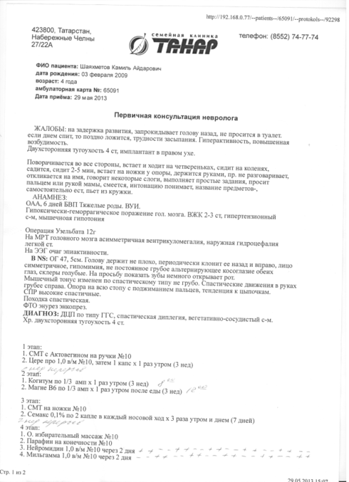 Зашли к ней в кабинет я и Камиль, в начале она спрасила, на что жалобы, я даже немного растерялась, начала говорить что плохо держит голову, она объяснила что это у Камиля гиперкенезы, тоесть непроизвольные движения, жаловалась, что плохо засыпает, очень возбужденный, активный, Далее она спросила где мы пролечились, ну я и немного рассказала, о войте, о Китае и т.п., так же рассказала про наши планы. Она очень внимательно послушала нас, и далее по ходу дела, посмотрела очень внимательно СНИМКИ МРТ головы и шеи, сделанные в Китае, который кроме Вана Исина, никто не мог сказать, что там и какие изменения, так же посмотрела ЭЭГ из центра Зайцева г. Спб, снимки тазабедренных суставов, и я ей рассказала, о том, как прошли роды, что я чувствовала, и как мне было нереально сложно.