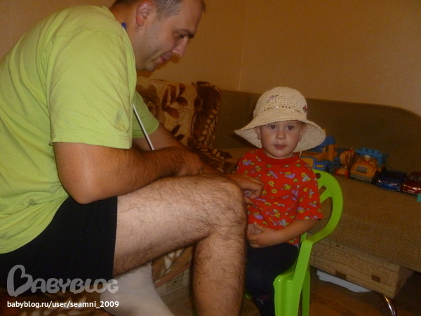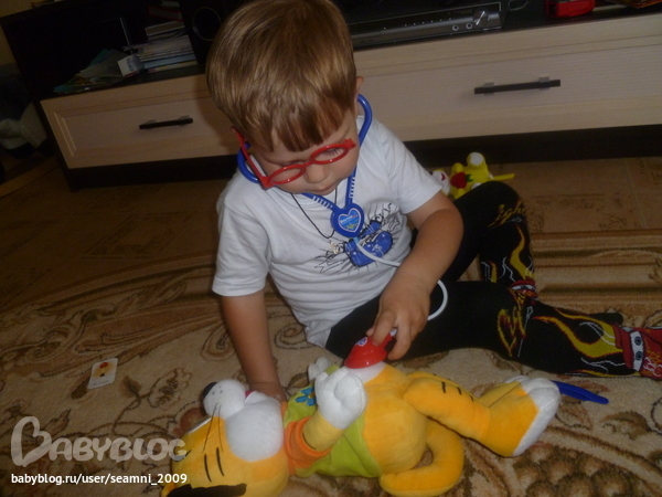 с папой играют в доктора) папа у нас признанный Мишей врач, только ему Миша доверяет выпаивать лекарства и смотреть горло)) и даже витамины я не могу ему выпоить, ждет папу!