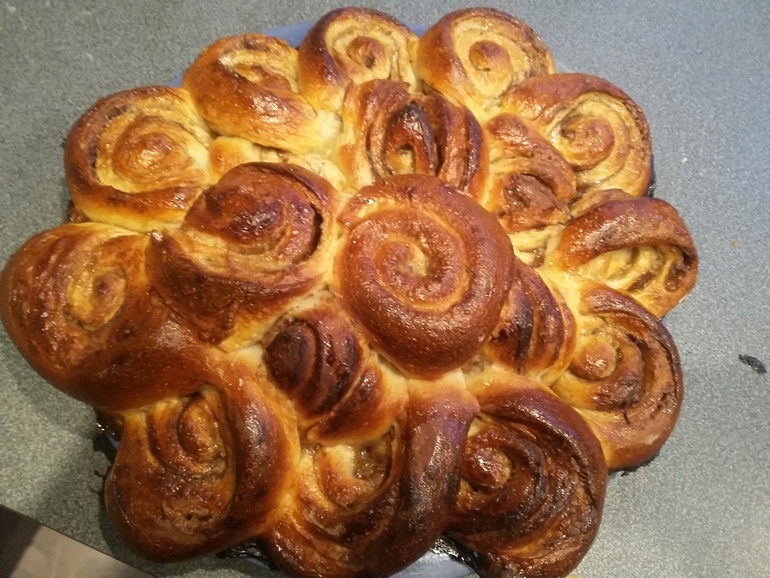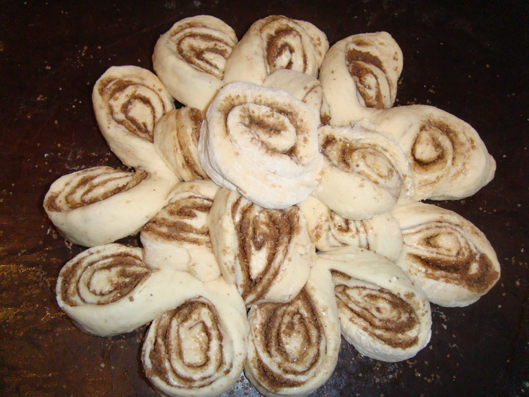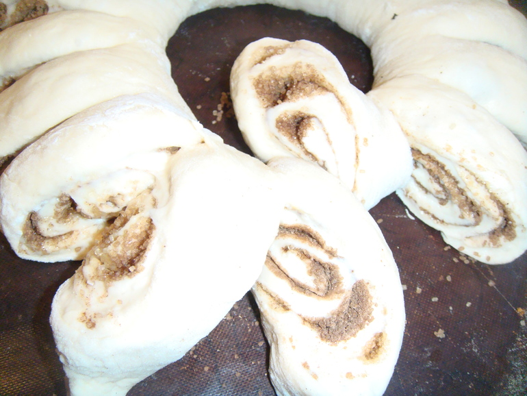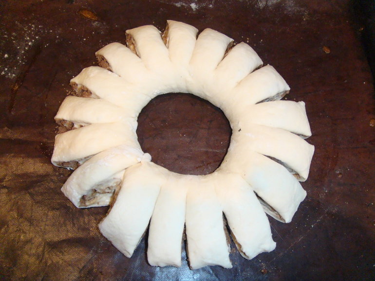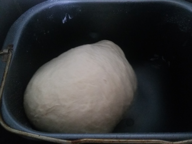 Заместить дрожжевое тесто. Я в хлебопечку налила 1 стакан кефира, 0,5 стакана растительного масла без запаха, 3 ст.л. сахара, щепотка соли, 1 ст.л. сухих дрожжей, 1 яйцо, 3 стакана муки (может понадобиться больше):