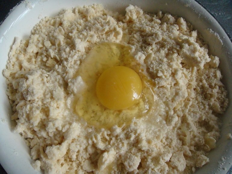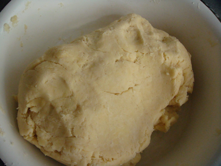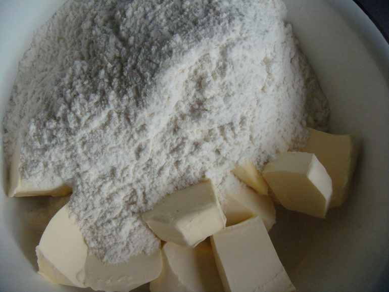 Растереть 300 г маргарина с 2 стаканами муки, 1 ч.л. разрыхлителя, 1 ст.л. сахара и щепоткой соли: