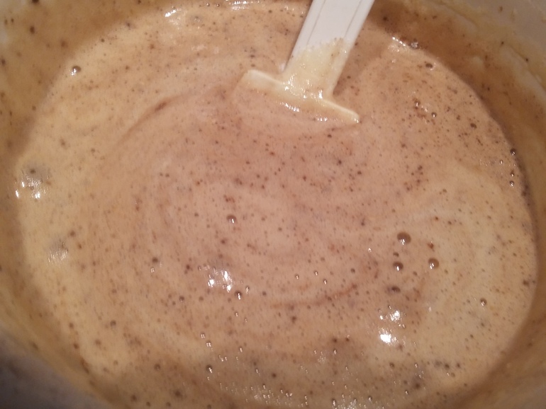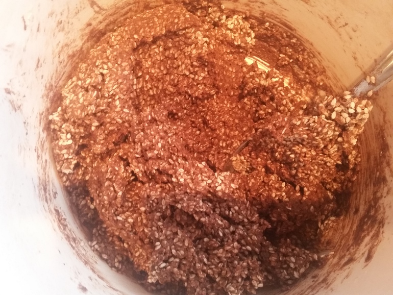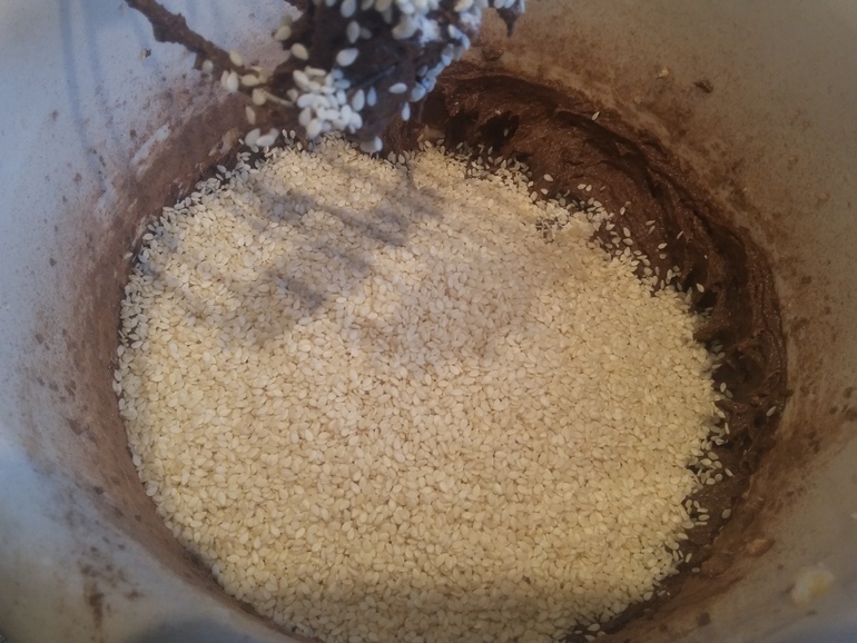 Всыпать 1 стакан кунжута, 1 стакан крахмала и 0,5 стакана муки (может понадобиться больше, если тесто будет совсем жидкое):