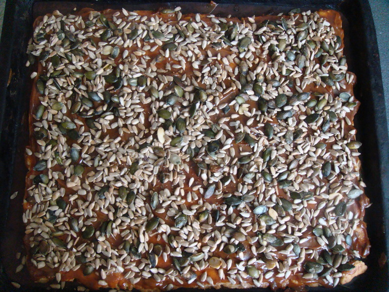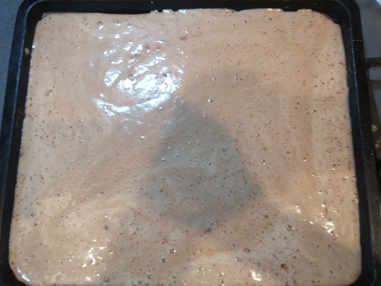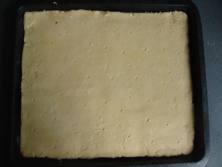 Тесто раскатать в пласт сантиметровой толщины и выложить на противень: