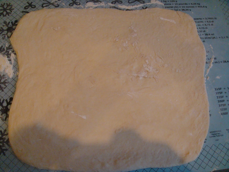 Дать тесту взойти. Обмять, раскатать пластом около 1 см: