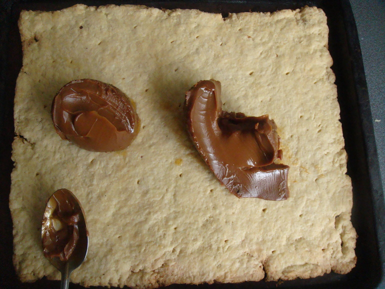 Проткнуть, испечь до легкой золотистости (не пересушите). Выложить вареную сгущенку или шоколадный крем:
