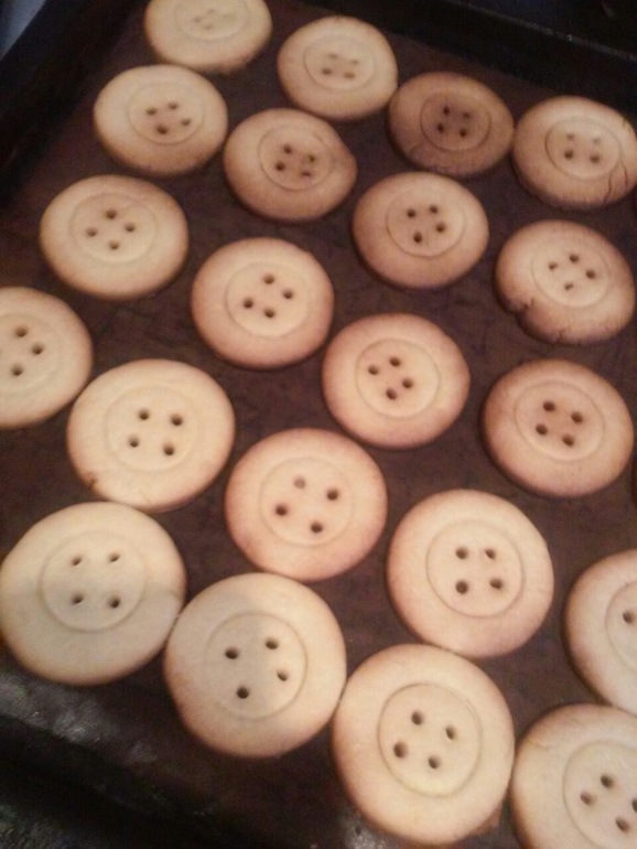 Для изготовления подойдет песочное тесто по любому рецепту. Рюмкой вырезать кружки, разложить на противень. Соломинкой для коктейля вырезать дырочки. Рюмкой меньшего диаметра сделать декоративный кружок. И испечь:
