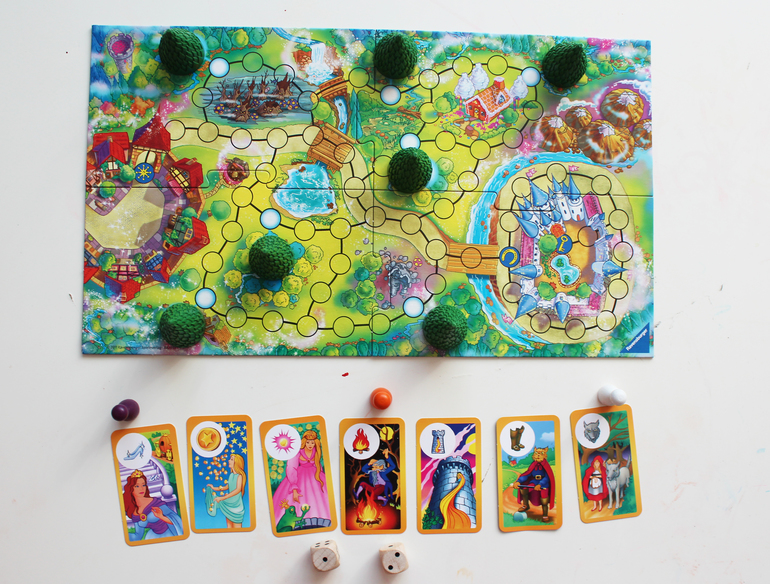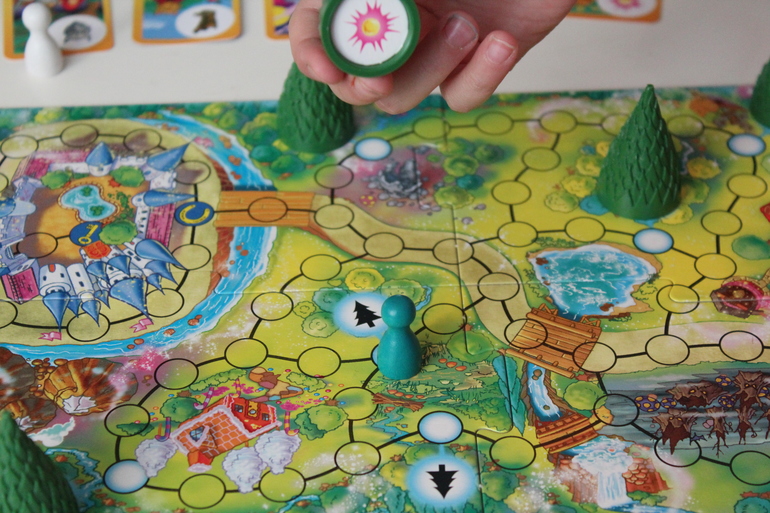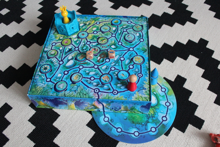Это ходилка, но ходилка необычная и очень интересная! Зовется она Sagaland - Сказочная страна. Игроки отправляются на поиски сокровищ из различных сказок (Золушка, Рапунцель, Кот в сапогах и др). Цель игры - узнать и запомнить под какой ёлкой спрятано то или иное сокровище, и набрать наибольшее количество карточек со сказками.