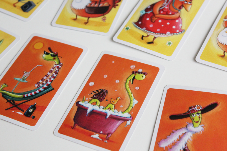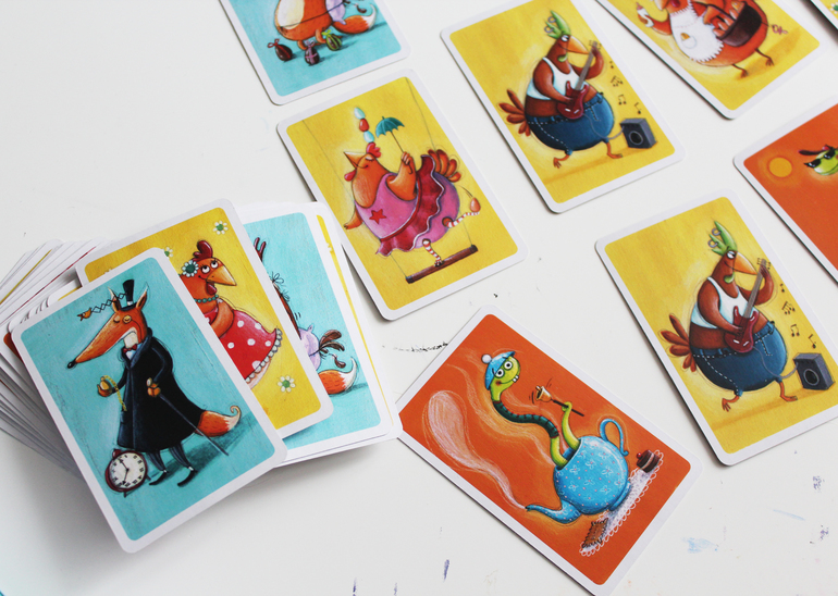 Задача игрока собрать как можно больше различных карт с животными (лисы, куры, змеи), при этом другие игроки будут пытаться утащить ваши карты, "съев" их. Так, например, лисы едят кур, куры едят змей, а змеи едят лис.