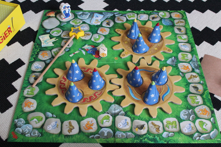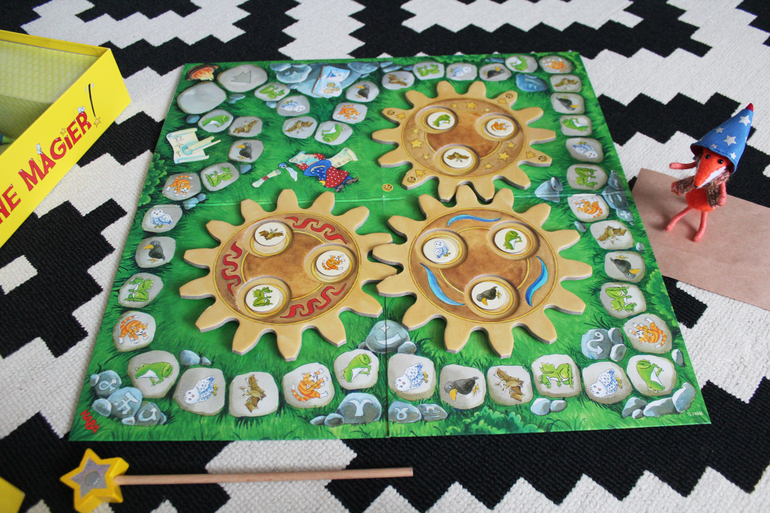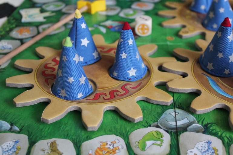 Если на кубике выпал специальный знак волшебника, это означает, что нужно покрутить шестеренки и следовательно задача игроков усложняется, ведь колпачки и животные под ними поменяли местонахождение.