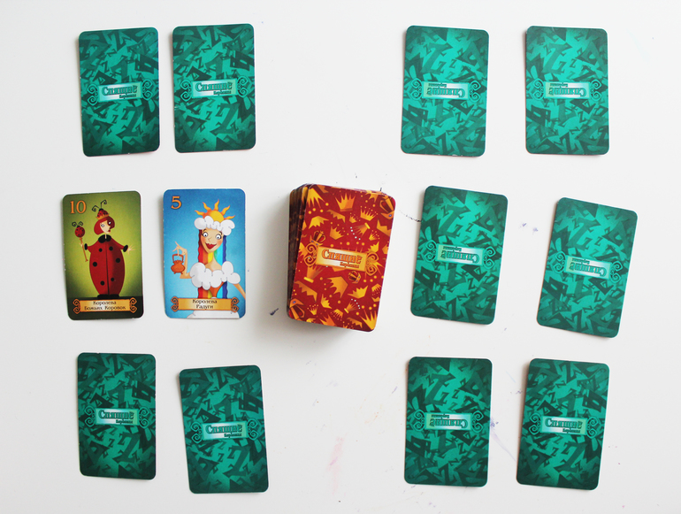 -сыграть Короля, чтобы разбудить спящих королев, лежащих в центре стола рубашками вверх.