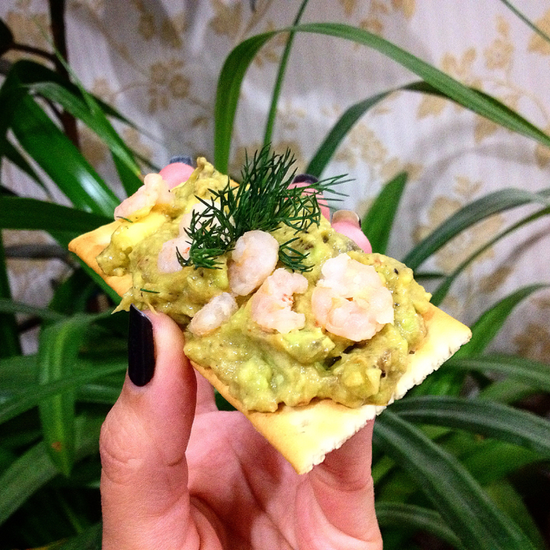 А это просто Авокадо вилкой разминаем...добавляем соль-перец-сладкий-чили-соус для пикантности. Эту пасту на крипсы с орегано. (можно просто на хлеб). И сваренные креветки сверху (можно без них). Просто, сытно и полезно.