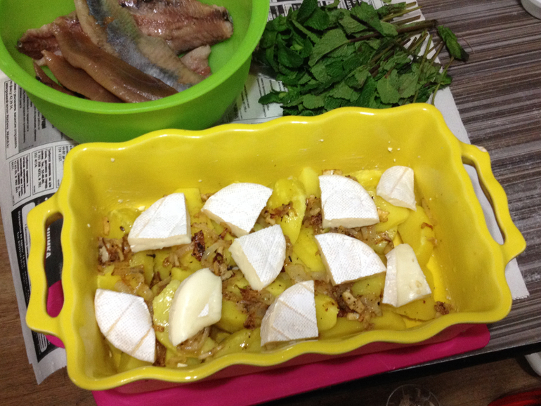 Все в духовку. Пока чистим-режем селедку и лук - все запекается.
