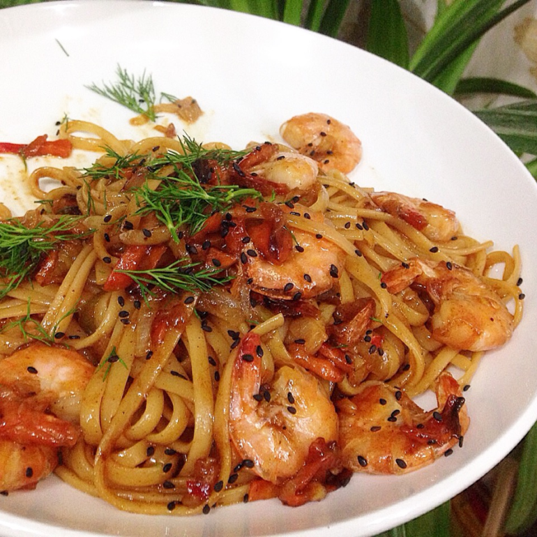 Смешиваем с пастой, и посыпаем черным кунжутом.