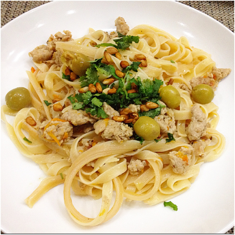 Смешиваем со сваренной альденте пастой. Обжаренные кедровые орешки, кинза.