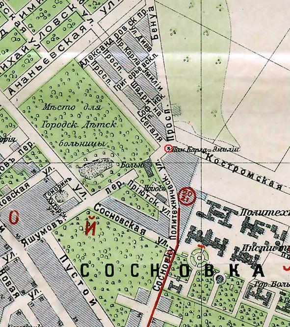 Года два назад я прочла книгу С. Глезерова о нашем районе, Лесное. Из нее я узнала историю петербургских влюбленных Карла и Эмилии. И вот недавно, проходя мимо трамвайного кольца на Тихорецком проспекте, я увидела памятный знак.